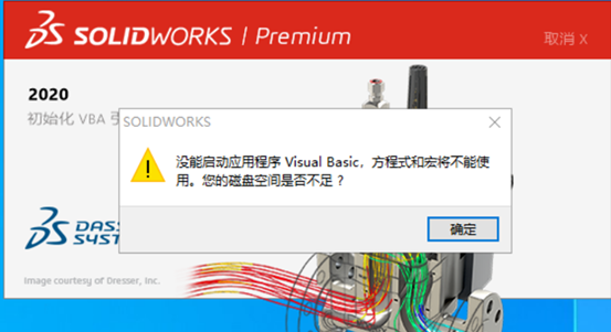 SolidWorks(以下简称SW)启动时报错“没能启动应用程序Visual Basic,方程式和宏将不能使用。您的磁盘空间是否不足?”,这个问题是SW未能启动Visual Basic引起的。Visual Basic是微软的产品,SW的方程式和宏使用了Visual Basic编写,所以需要Visual Basic支撑运行。
