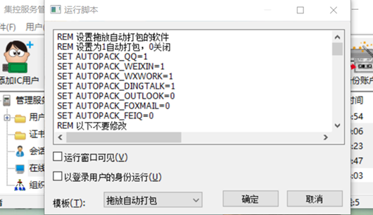 1、 集控服务管理器打开“在线用户”,选中需要设置的客户机 2、 右键菜单->执行脚本 在“运行脚本”对话框的“模板”中选择“拖放自动打包”。 3、 按脚本开头处的说明选择需要开启自动打包的应用 AUTOPACK_QQ:对应QQ AUTOPACK_WEIXIN:对应微信软件 AUTOPACK_WXWORK:对应企业微信 AUTOPACK_DINGTALK:对应钉钉 AUTOPACK_OUTLOOK:对应Outlook邮件 AUTOPACK_FOXMAIL:对应Foxmail邮件客户端 AUTOPACK_FEIQ:对应飞秋 以上设置为1为自动打包,设置为0关闭 4、 配置完成后,点“确定”按钮 通过以上配置,客户机把加密文件拖放到开启自动打包的应用窗口时,待传输的文件会自动打包成加密的enc文件,这个文件可以安全地在互联网传输。即使这些通讯软件在云端留下传输副本,没有secWall的企业通行证,文件也是无法打开的,这样可以保证通过互联网传输的敏感文件不会因进入公网而涉密。 二、 使用自动打包的注意事项